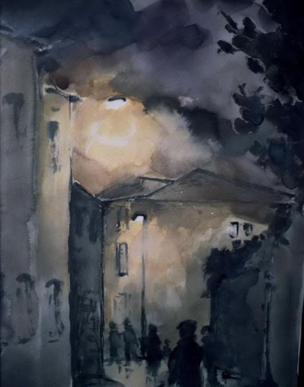 Après la messe de minuit rue Mille souris. Luçon A4 Aquarelle