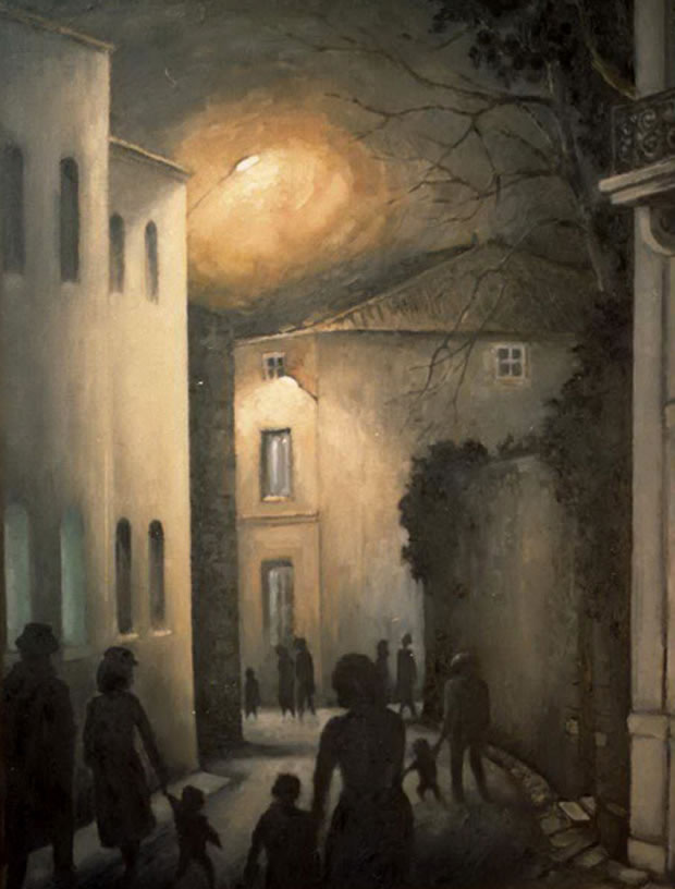 Après la messe de minuit rue Mille souris. Luçon 15 P Huile sur toile